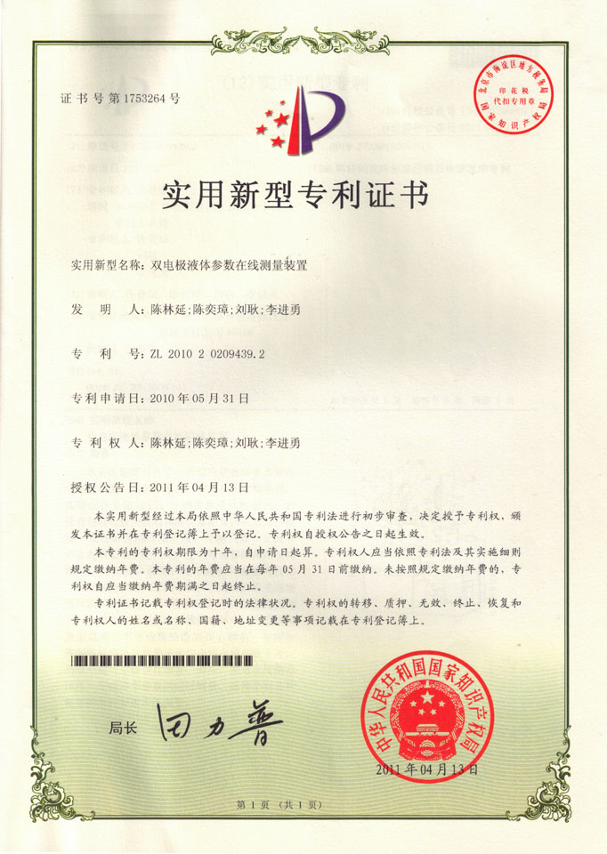 雙電極液體參數(shù)在線測(cè)量裝置(雙電極測(cè)量裝置),專利號(hào):ZL 2010 2 0209439.2