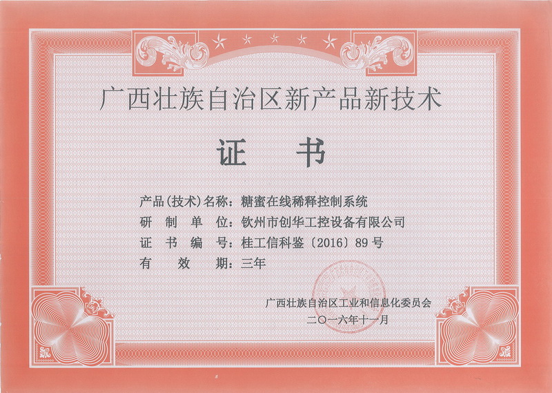 項(xiàng)目針對(duì)糖廠結(jié)晶工段糖蜜稀釋工序無法按需連續(xù)稀釋、溶晶不徹底、溫度波動(dòng)大,影響產(chǎn)品質(zhì)量和糖分回收的現(xiàn)狀,研發(fā)出“糖蜜在線稀釋系統(tǒng)”,實(shí)現(xiàn)了糖蜜稀釋過程中溶晶徹底,錘度和溫度有效控制,使結(jié)晶罐能做到沸點(diǎn)連續(xù)入料。項(xiàng)目產(chǎn)品“糖蜜在線稀釋系統(tǒng)”獲得廣西壯族自治區(qū)工業(yè)和信息化委員會(huì)委頒發(fā)的新產(chǎn)品新技術(shù)證書。